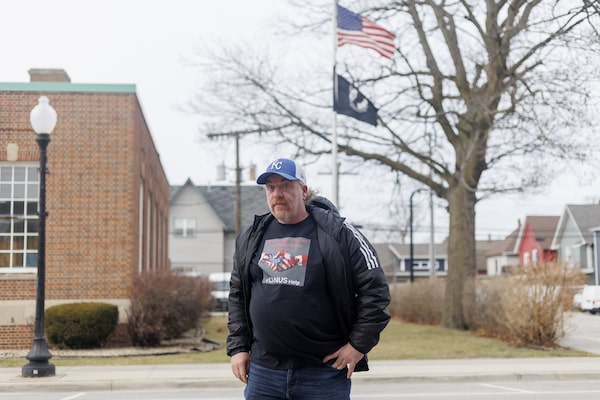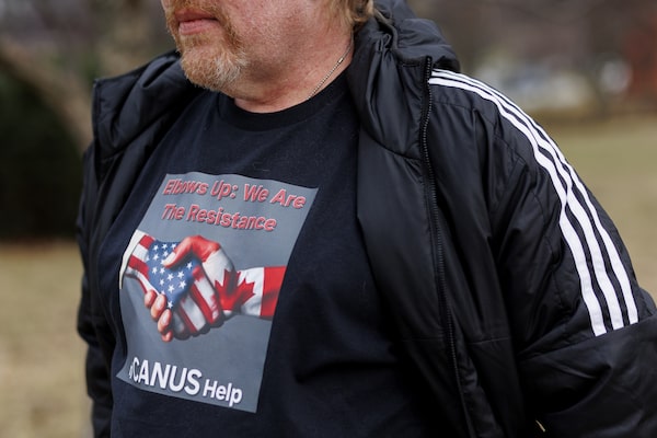 Keith Adams wears a custom shirt, which reads 'Elbows Up: We Are The Resistance', which was made locally at a store in Whiting, Ind., on March 15.Laura McDermott/The Globe and Mail