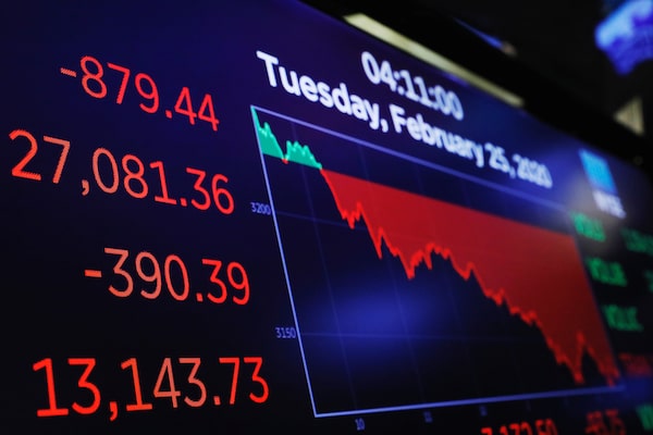 The day's numbers are displayed at the New York Stock Exchange on Feb. 25, 2020. In spite of the recent chill on markets, investors need to take on more risk, writes Rob Carrick.LUCAS JACKSON/Reuters