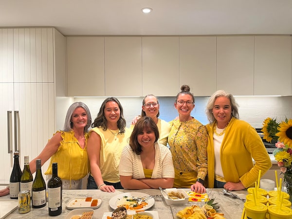 Nancy Brennan, Florence Gabriel, Irene McConney, Emily Praamsma, Tina Braun and Michelle Adams at a yellow-themed dinner party in Toronto in July, 2024.Supplied