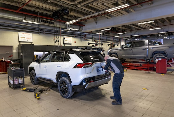 An employee installs a license plate mount on a brand new Toyota RAV4 in the service department at Heninger Toyota in south Calgary on March 4.Amir Salehi/The Globe and Mail