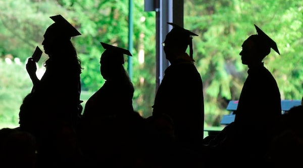 File photo shows graduates lined up to receive diplomas at Berkshire Community College in Lenox, Mass., on June 1, 2018.The Canadian Press