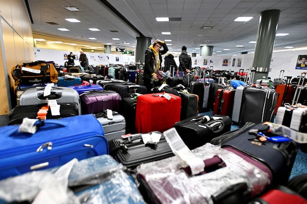Passengers search for luggage following flight cancellations and delays caused by a winter storm at Vancouver International Airport in Richmond, B.C., on Dec. 22, 2022.JENNIFER GAUTHIER/Reuters