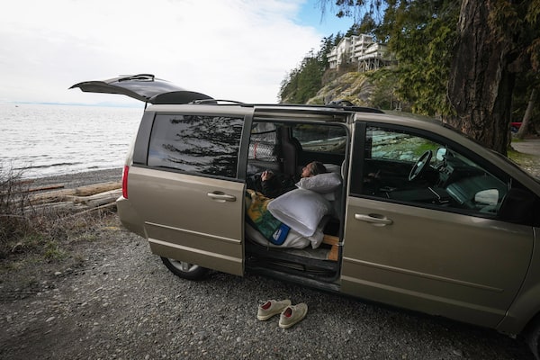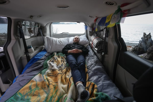 Hugo Unwin lays on top of his minivan that he lives in on the Sunshine Coast, in Gibsons, B.C., on March 10.DARRYL DYCK/The Globe and Mail