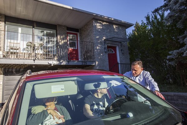 From right, Mike Franzgrote bids his son, daughter-in-law and 3-week-old grandson farewell as they begin their journey to their newly purchased home in Moncton, N.B.Bryan Dickie/The Globe and Mail