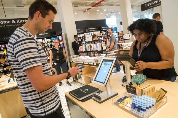 Daniel Thorpe, of Hoboken, N.J., uses the Amazon app to pay for his purchase at the Amazon 4-star store in the Soho neighborhood of New York, on Sept. 27, 2018. More and more financial institutions are making round-up apps available.Mary Altaffer/The Associated Press
