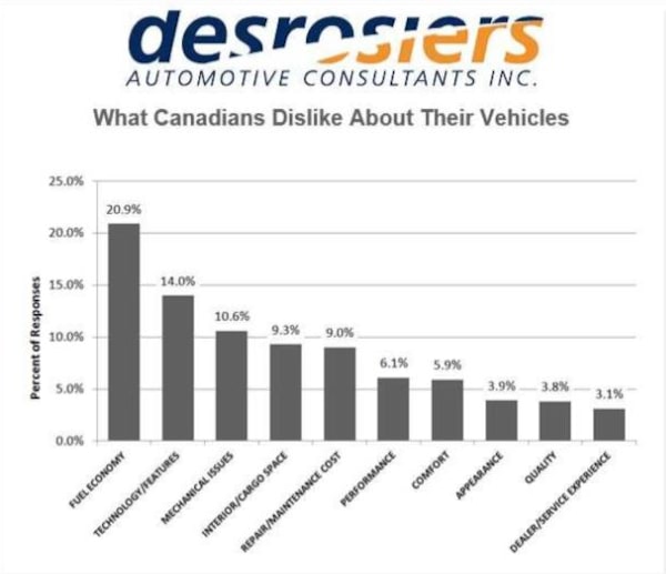 It’s fuel economy. DesRosiers Automotive Consultants did a survey of what Canadians dislike about their vehicles, and fuel economy was mentioned by 20.9 per cent of the 4,500-plus vehicle owners who participated. Technology/features was mentioned by 14 per cent and mechanical issues by 10.6 per cent. Arguably, people who complain about fuel economy are really saying they’re unhappy with how much it costs to operate their vehicle.