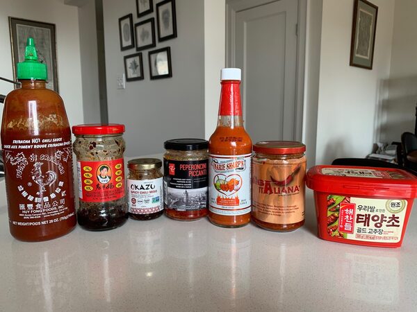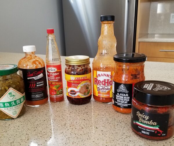 I know from personal experience that a great way to add variety to all the eating we’re doing at home is to keep a good inventory of hot sauces and condiments in your fridge. Here are some ideas to get you started, and here’s a picture of my current hot sauce selection.