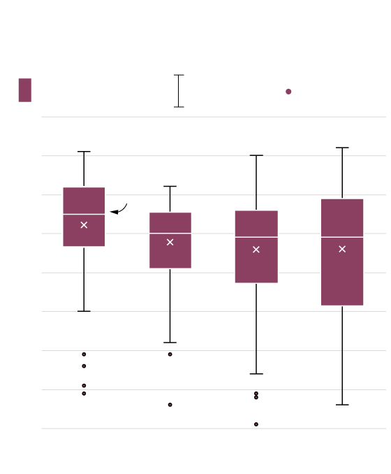 Each box in the chart captures everyone from the 25th percentile to the 75th percentile. The middle line in the box is the median life span. The outside vertical lines capture everyone else except for a few outliers, as shown by the small circles. The “x” is the average life span.