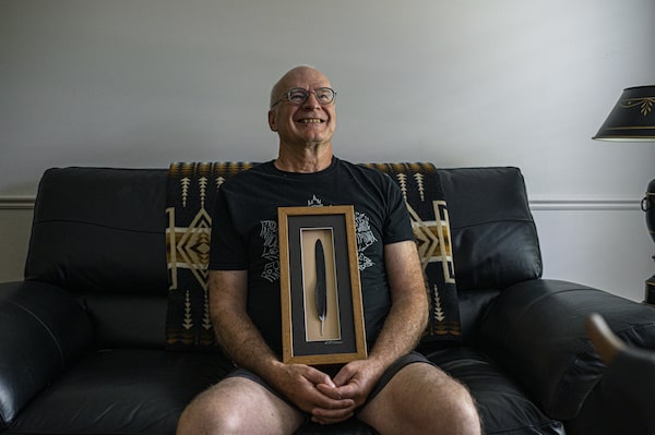 Brian Waldron holds a framed crow's feather that he carved out of wood at his home in Burlington, Ont., on May 15.Christopher Katsarov/The Globe and Mail