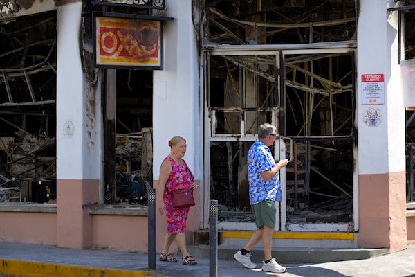 Tourists walk past a burned shop in Puerto Vallarta on Tuesday.ALFREDO ESTRELLA/AFP/Getty Images