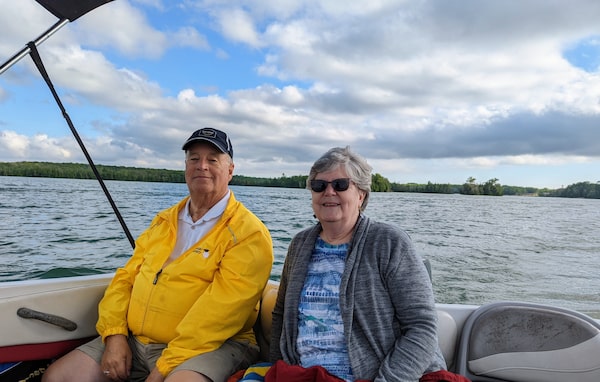 Bev and Peter Hambly on a boat on Berford Lake.Supplied