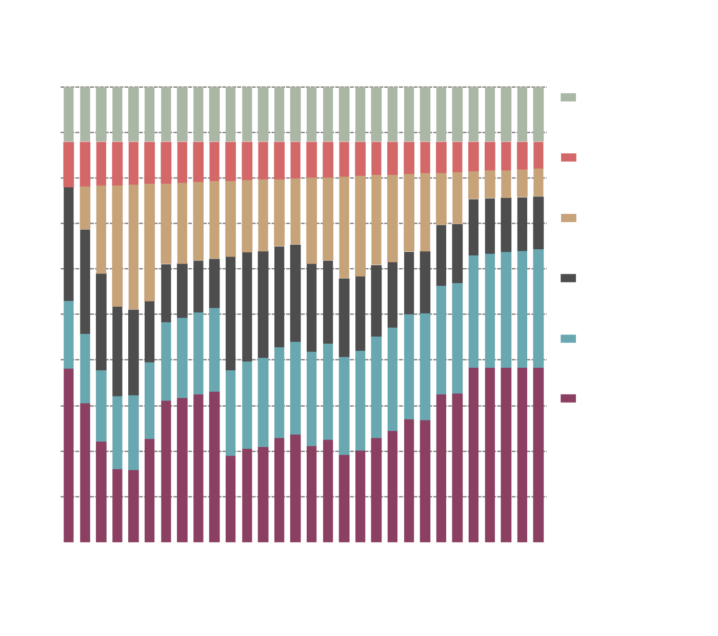 This chart shows the spending breakdown by year for a two-earner middle-income couple with two children over the period 1990 to 2019. Note spendable income never exceeds 40 per cent of gross income. If the mortgage is paid off and the children become self-supporting by retirement age, a good retirement income target is 50 per cent of gross income (this includes an allowance for income tax plus a buffer).