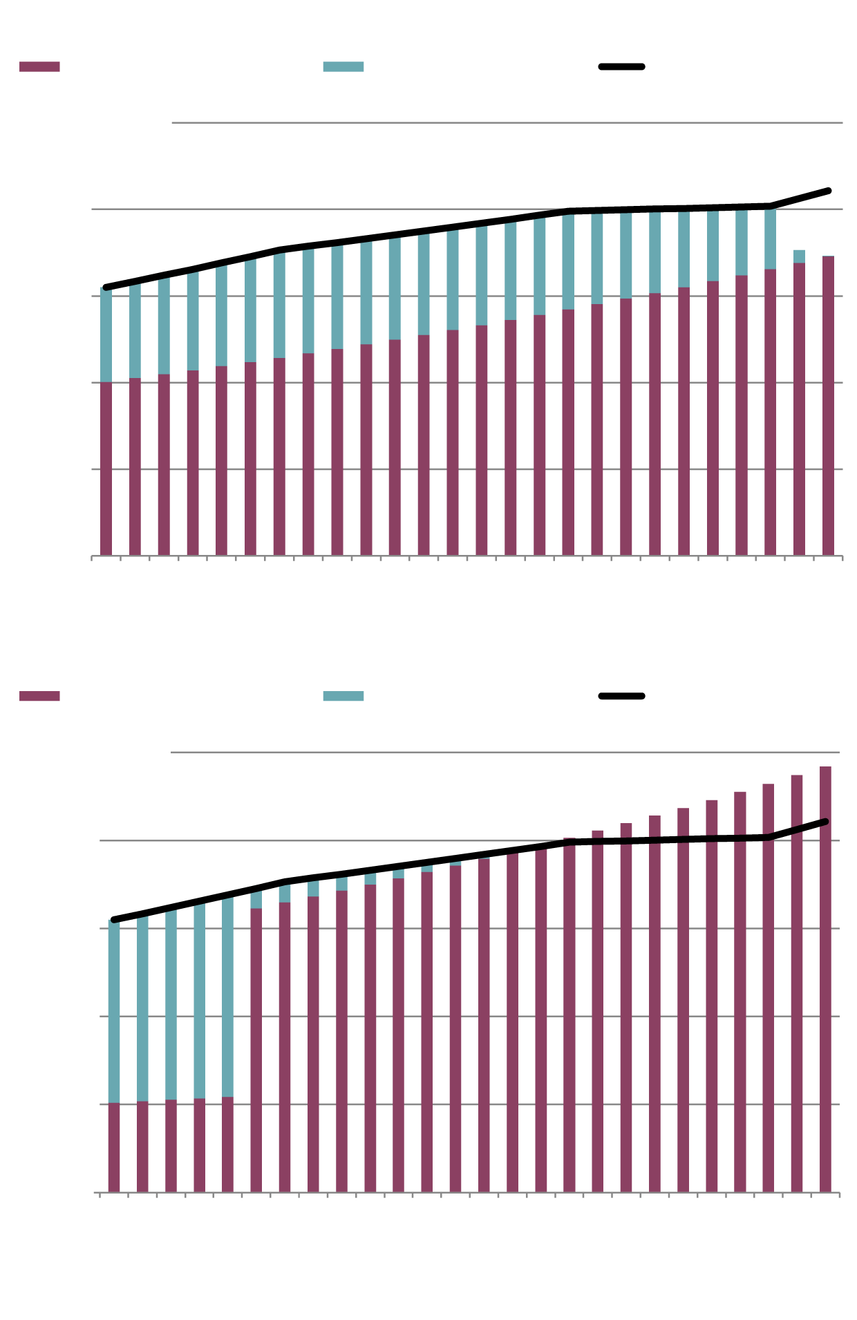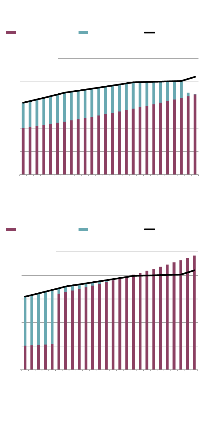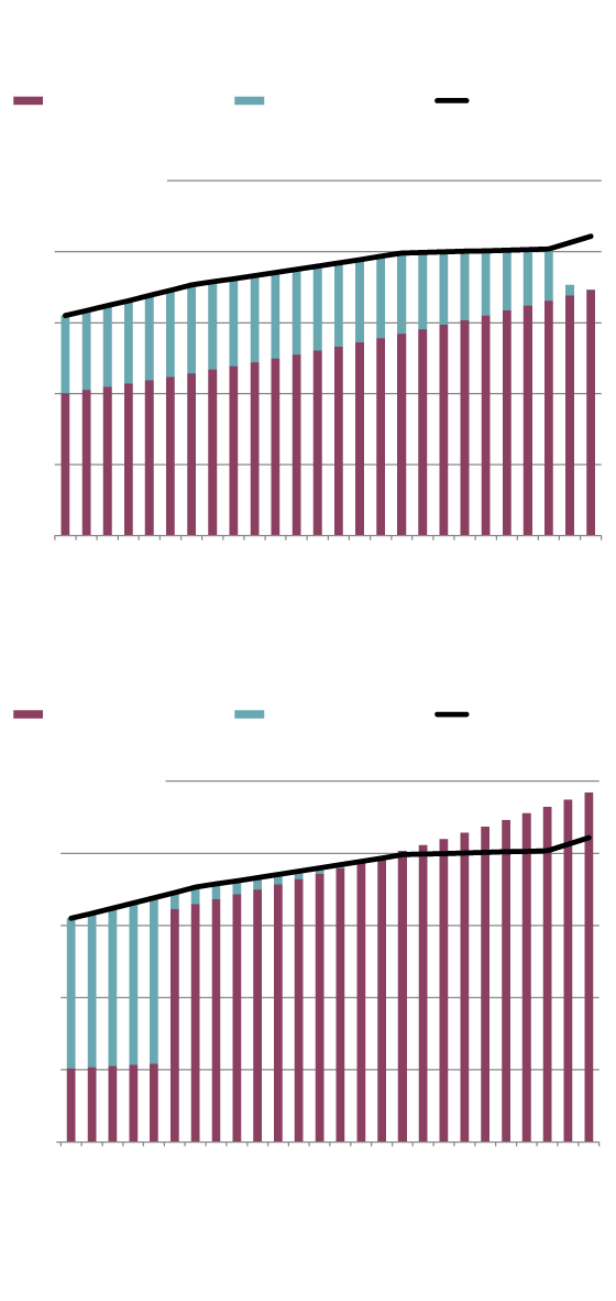 The Singhs take a different tack. They wait until 70 to start their CPP pensions, at which point the starting amount will be 42 per cent larger in real terms. In addition, they redirect $100,000 of their $500,000 in RRIF assets to an insurance company to buy a joint life annuity. Their projected income is shown in the second bar chart.