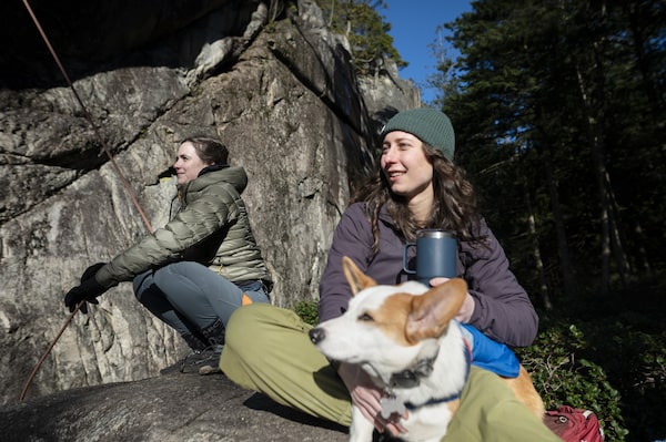 Camille Boulianne belays a friend while Sarah Klinkow takes advantage of her rest time to pet Corgnelia, during an afternoon of sport climbing at Murrin Provincial Park, in Squamish, B.C, on Jan. 21.Tijana Martin/The Globe and Mail