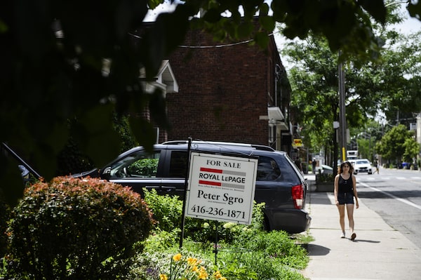 People walk past real estate properties in Toronto, on July 12, 2023. A CIBC analysis shows that 31 per cent of recent first-time homebuyers this year have received a gift for their down payment, up from 20 per cent in 2015.Christopher Katsarov/The Globe and Mail