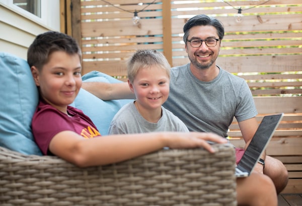 Owen Charters and his two sons Isaac,12, and Elliott, 8, in their Toronto home on Aug 30, 2021. He has set up trust accounts for Isaac and Elliott as he helps them learn about investing.Fred Lum/The Globe and Mail
