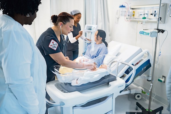 Students train in a “high-fidelity” environment, using lifelike manikins that breathe, sweat, cry and respond like real patients, to perform procedures such as inserting IVs and catheters to build confidence and skill.