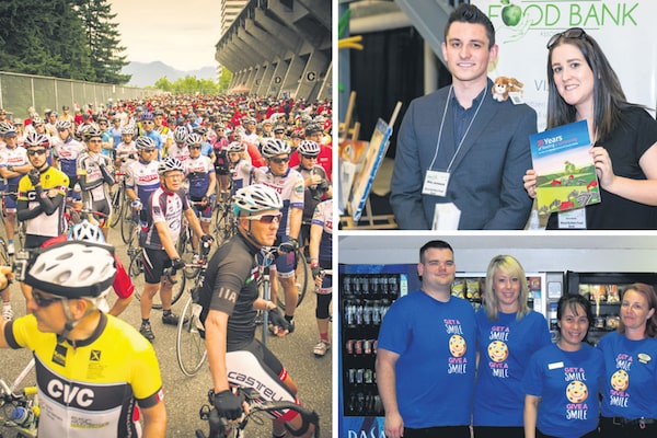 Canadians of all ages join events in support of many causes, for example, the Fort McMurray Timeraiser during National Volunteer Week (top right), the CMHA’s Ride Don’t Hide fundraiser (left) and the Northern Lights Health Foundation’s Smile Cookie Week (bottom right). A recent Imagine Canada report indicates that reaching donors belonging to different generations and demographics is becoming more and more important for the sustainability of Canada’s non-profit sector.SUPPLIED