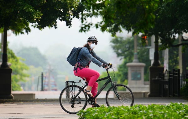 A person wears a mask as they cycle through Majors Hill park in Ottawa on Friday, in June, as wildfire smoke from Manitoba hangs over the National Capital region.Sean Kilpatrick/The Canadian Press