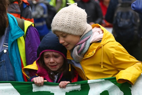 Swedish climate activist Greta Thunberg consoles a young demonstrator as they take part in a Youth Strike 4 Climate protest march in Bristol, England on Feb. 28, 2020.GEOFF CADDICK/AFP/Getty Images