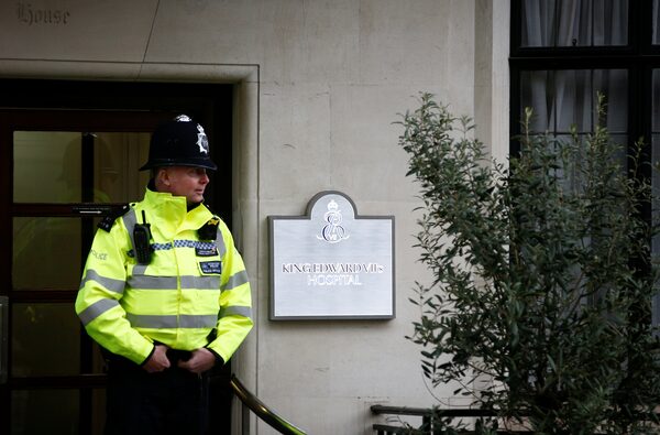 Police officers stand outside the King Edward VII's Hospital where Britain's Prince Philip recently underwent hip replacement surgery, in central London, Britain, April 8, 2018.HENRY NICHOLLS/REUTERS