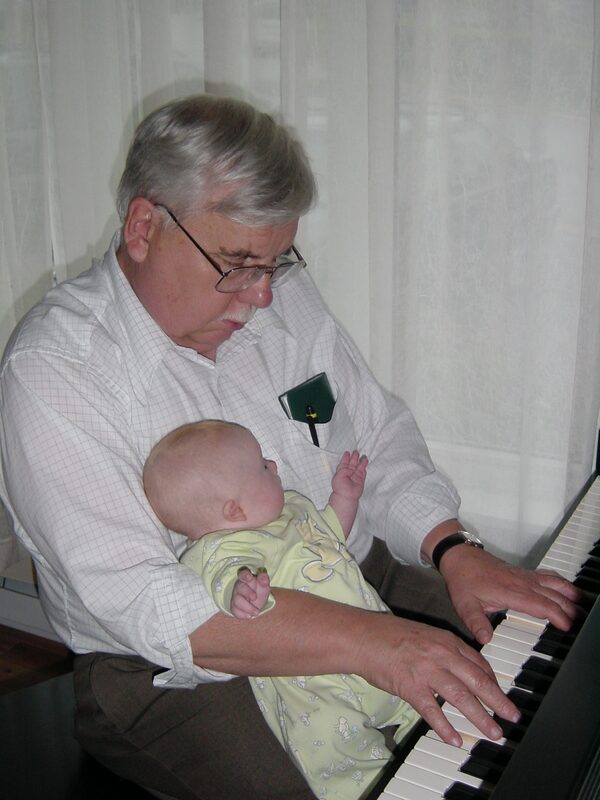 The piano bench was his happy place. He worked through many a stressful day by singing the blues – St. James Infirmary Blues, Georgia or The Lady is a Tramp (which he always requested for Margi when they went to jazz concerts). He delighted in balancing babies in his lap as he played.