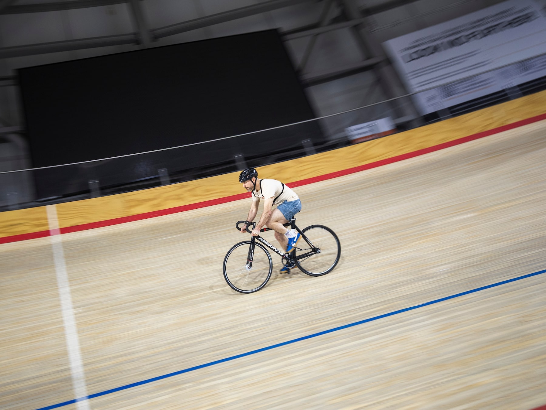 As I walk my rental bike – a Montreal-designed Argon 18 – onto the smooth concrete apron below the track, Chris Reid, executive director of the National Cycling Institute Milton (NCIM), describes the layout: the matte blue “Côte d’Azur” encircles the bottom of the track as a (literally) soft inner border. The red and black lines above it frame the sprinter’s ideal path; and the blue “stayer” lines high above are a border for Madison (a relay event in track cycling) races.