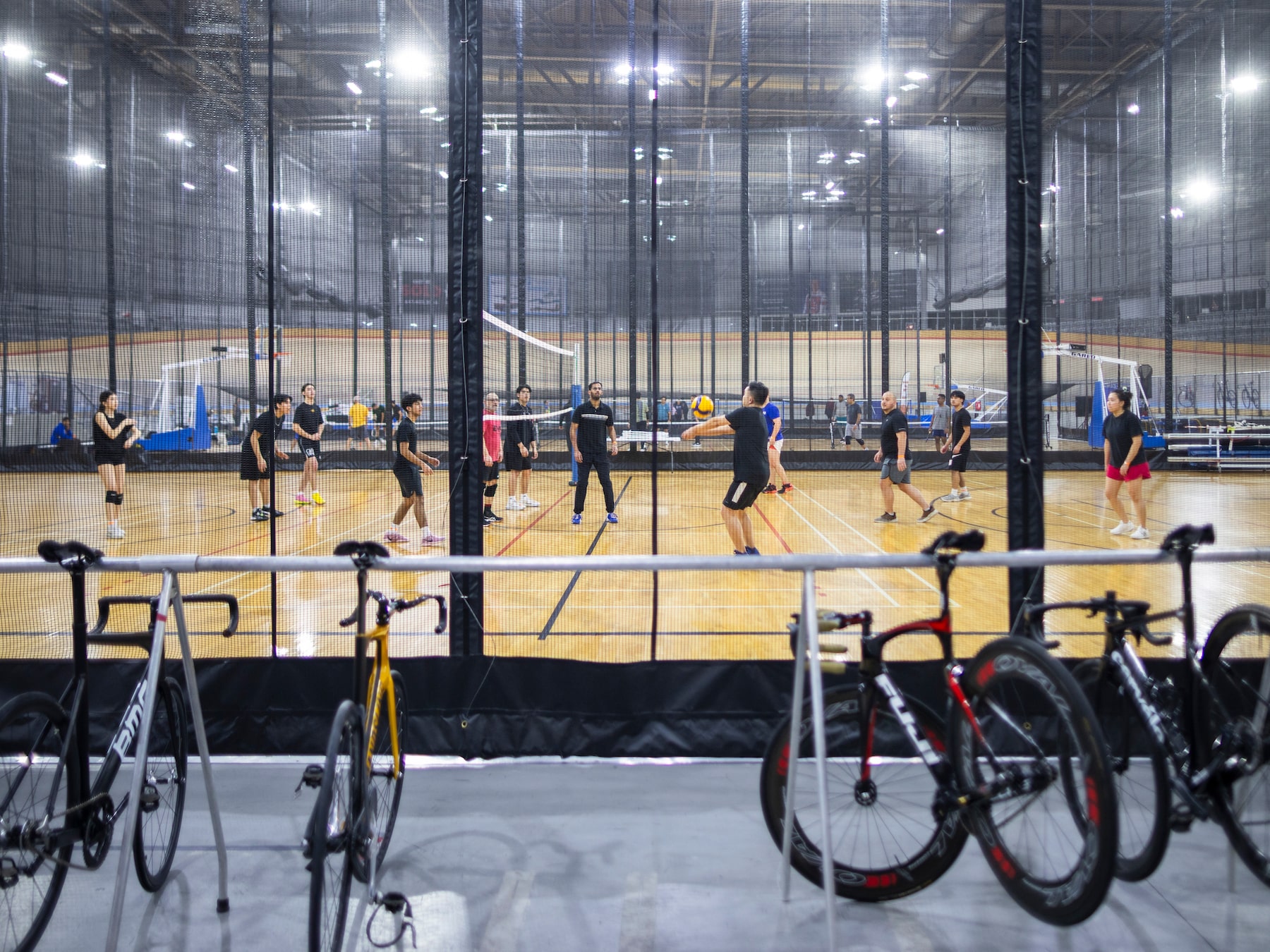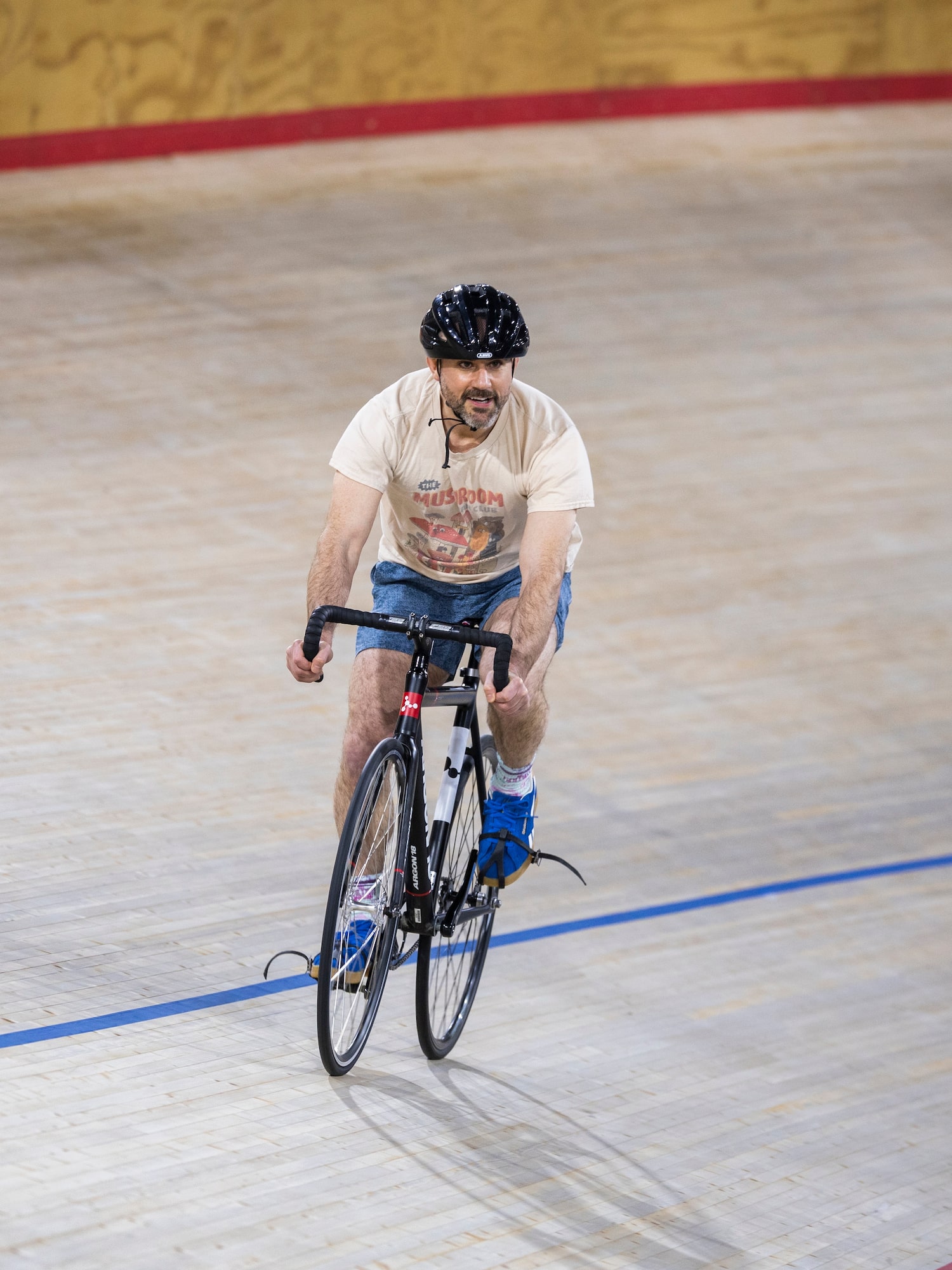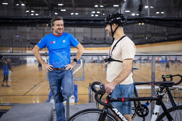 After two circuits along the bottom, Higgins positions me between the black and red lines, where racing happens. As I pedal, I peek inward, toward the three hardwood-floored gymnasiums encircled by the track. Here, pickleball and badminton games are in full swing. Above us, adults of all ages orbit the walking and running lanes – typical community centre stuff.