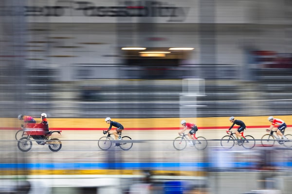 Cyclists make their way around the velodrome during a motor-paced training session.