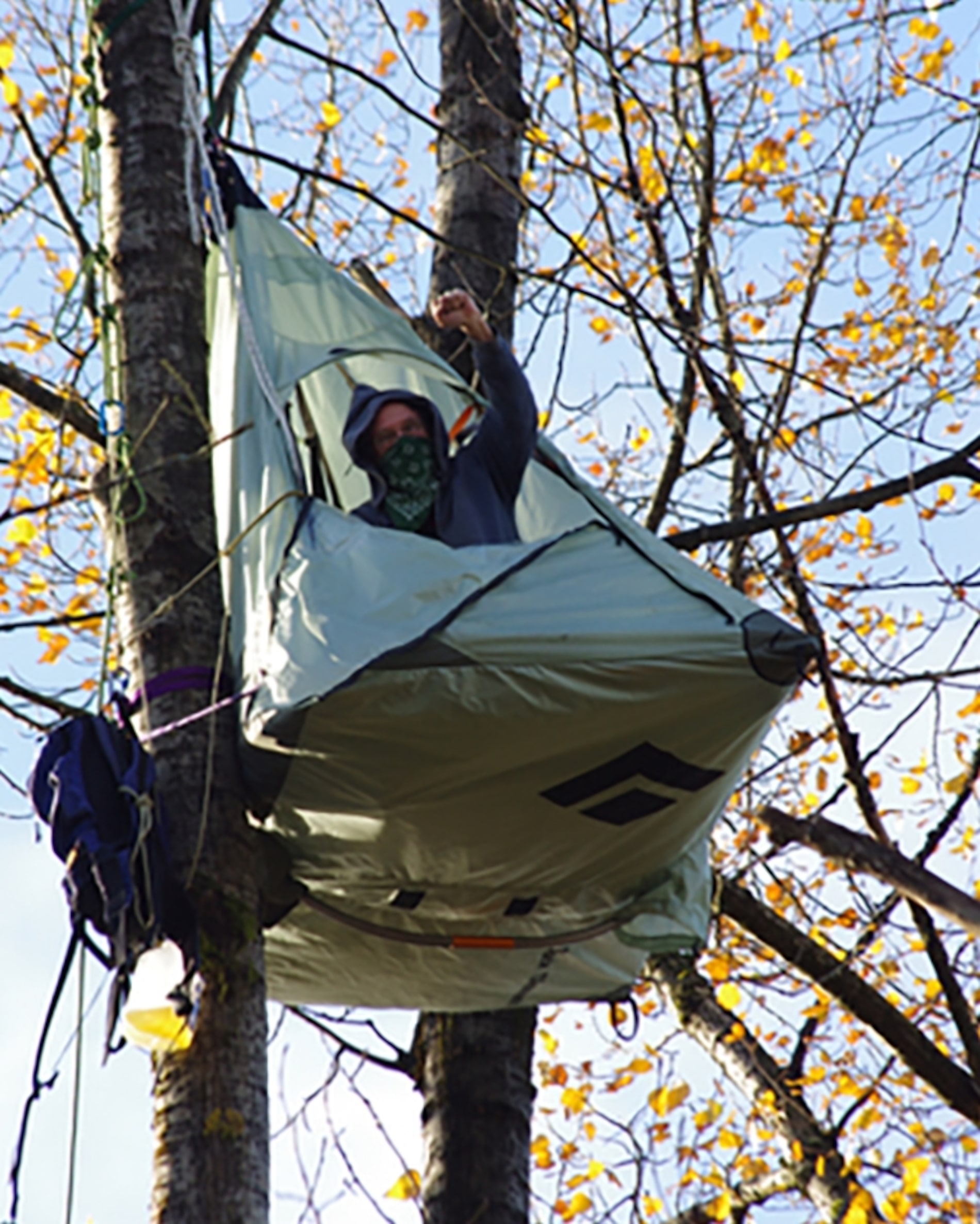 In the Brunette River Valley, Dr. Takaro staked out a very high cottonwood tree. A rock climber all his life, he climbed some 35 metres up the trunk, slung a rope around a nearby tree and built a platform on which to pitch his tent.