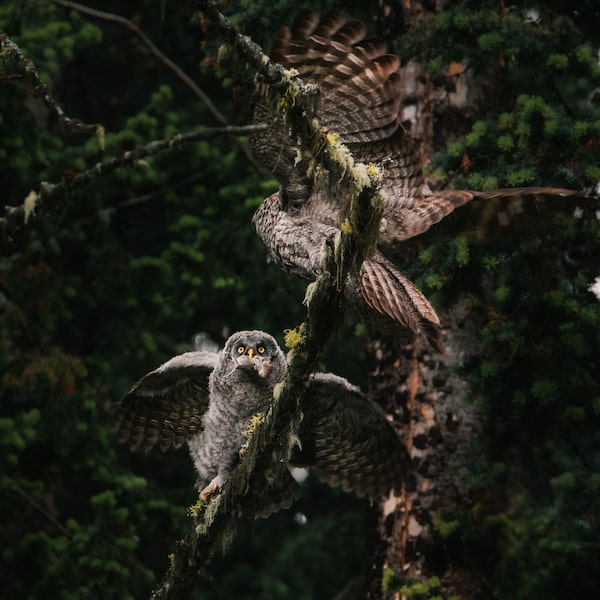 Two great gray owls in Kamloops, B.C, photographed by a participant in the BC Young Birders Program. One of them has prey in its mouth.Ian Harland/Supplied