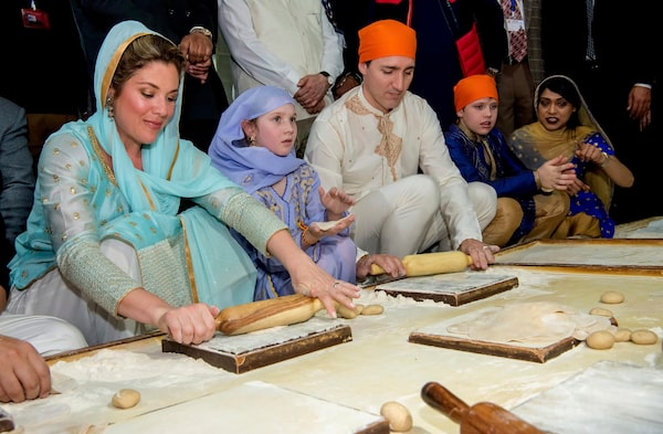 Prime Minister Justin Trudeau, third left, and his wife Sophie Grégoire Trudeau, left, make rotis, or Indian flat bread, during their visit to Golden Temple, in Amritsar, India, on Feb. 21, 2018. During the Trudeaus’ February visit to India, Ms. Grégoire Trudeau was photographed on several occasions draped in the designer’s jewellery and wearing a handmade Kim Smiley dress, encrusted with colourful Swarovski crystals.Prabhjot Gill/The Canadian Press
