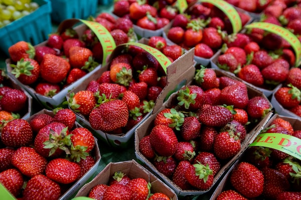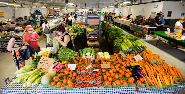 TORONTO - AUGUST 22, 2020 - A steady flow of customers seek out fresh Ontario fruits and vegetables at St. Lawrence Market on August 22, 2020. The harvest of blueberries, strawberries, peppers, garlic, turmeric, potatoes and mushrooms make their way to urban Toronto from farms like Eborlall, Colwell, Jorge’s and Marvin’s Garden from small towns including, Beamsville, Waterford, Watertown, and Nestleton.Glenn Lowson