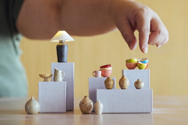 Her preference for realism drove her to seek out better options for the dishes she was using to style her tiny kitchen scenes in particular, finding limitations in quality. After seeing a mini-pottery wheel for sale online, she started watching regular-sized pottery tutorials on YouTube and taught herself how to scale down the techniques. In the beginning, “I was terrible. I have a first video that I cannot watch,” she laughs.