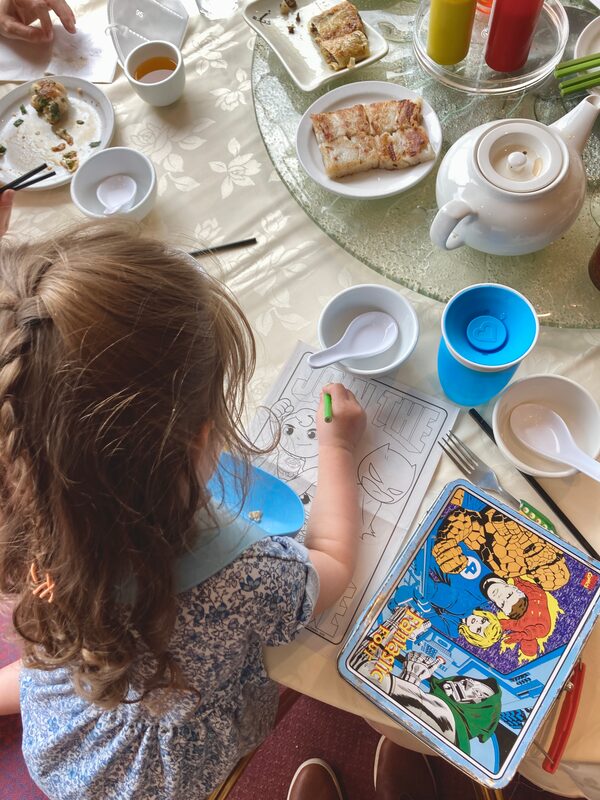 Passing servers offer us luobo gao (turnip cakes) and char siu bao (steamed pork buns). So there is immediately food on the table for her. After 30 minutes she begins to fidget, so I pull a Fantastic Four lunch box from my backpack. Opening the lid slowly to tease out the anticipation, I slide it over to Puddin’. For the rest of the meal, she is transfixed by the collection of crayons, colouring pages, stickers and multihued pipe cleaners, occasionally pausing to try a new food item, switch seats or oscillate her neck to take in the room’s flurry of motion.
