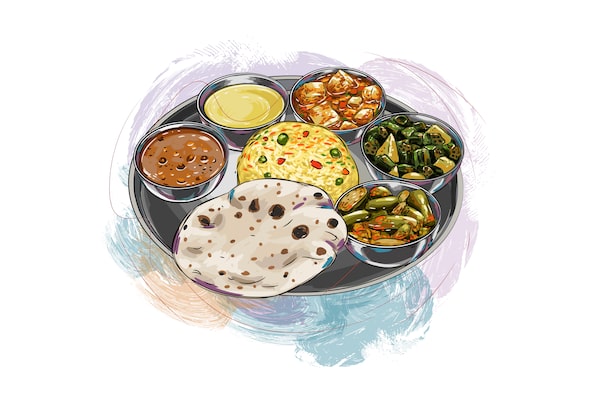 A thali, traditionally a large round plate holding a variety of small bowls filled with diverse dishes, is often curated to represent a region or community. In the context of Indian cuisine, it’s a complete meal, consisting of flatbread, lentils, vegetables, chutneys, pickles, and sometimes meat or a dessert.