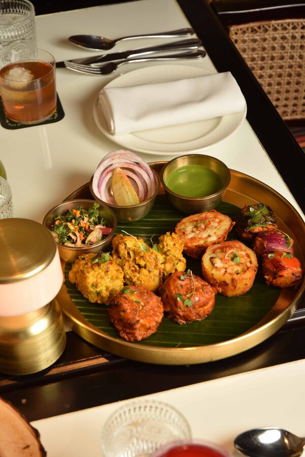“Typically, thalis are prepared and eaten together at home,” she says. “At our restaurant, we’ve transformed the thali into a shared platter experience, served on a metal platter called a ‘thal’ with smaller bowls called ‘katoris’ for condiments and salads.” Unlike the traditional solo meal format, Adrak’s version is designed for group sharing, focusing on a selection of appetizers rather than a complete meal with gravies. This adaptation maintains the spirit of the traditional brass thal while enhancing the communal dining experience.