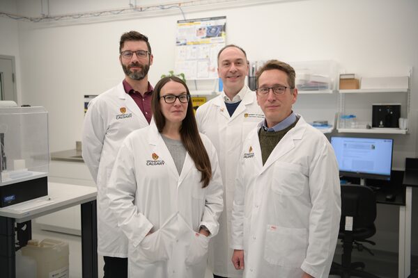The research team, including Dr. Dustin Pearson, back left; lead researcher Dr. Aaron Goodarzi, back right; Dr. Kerri Miller, front left; and Dr. Michael Wieser, front right, believe toenails contain crucial data about radon exposure.Sarah B Groot/The Globe and Mail