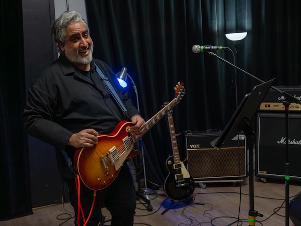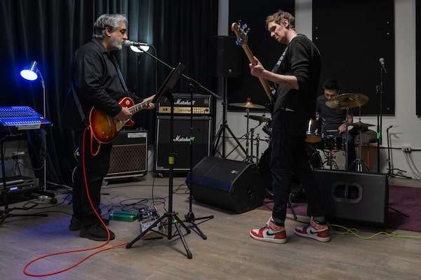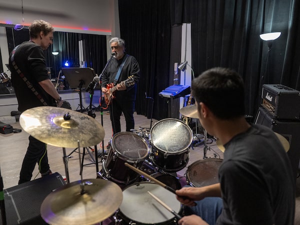 Mr. Khavari, centre, rehearses with bandmates Steve Yee, right, and Owen McIntosh, as an outlet to prevent burnout following intense writing sprints at the video game studio.Sarah Espedido/The Globe and Mail