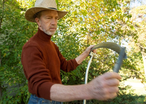 Peter Dowling sharpens a scythe on his farm.Courtesy of Andree Thorpe