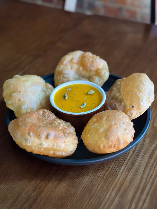 Place chilled aam ras in a serving dish and garnish with saffron threads. Serve warm puri alongside chilled aam ras for ripping and dipping.