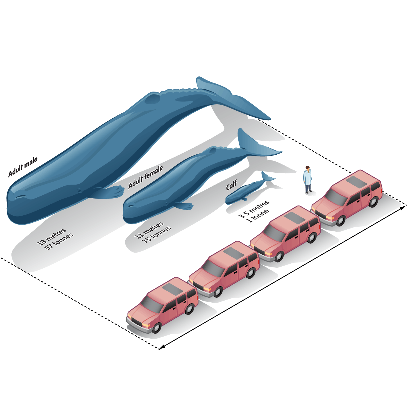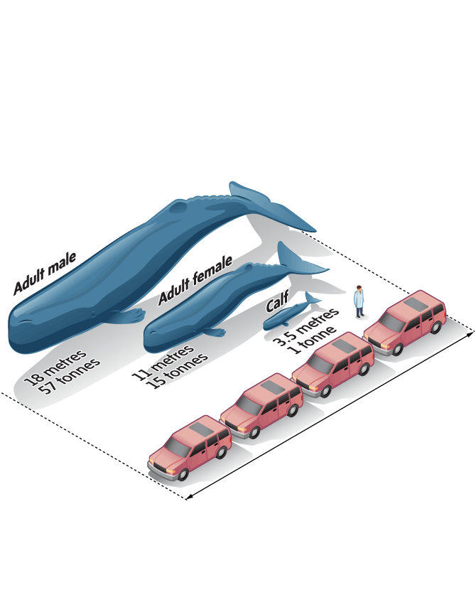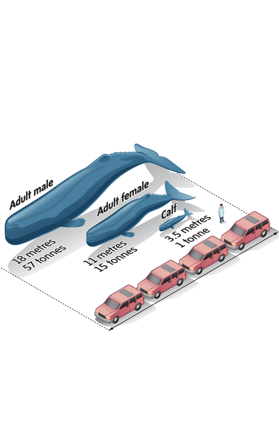 The mighty sperm whale has a distinctive square-shaped head that makes up about a third of its body length and houses the largest brain of any animal. Adult males can reach 18 metres – roughly the length of four parked SUVs – and weigh up to 57 tonnes, or about 37 SUVs.