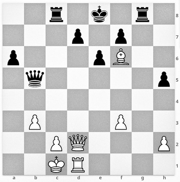 White played 24.Qd6 threatening mate. Black tried Rxc2+ 25.Kxc2 Qf5+ 26.Kc1 Qxf6 27.Qxd7+ Kf8 28.Qc8+ Kg7 29.Rg1+ and White won.