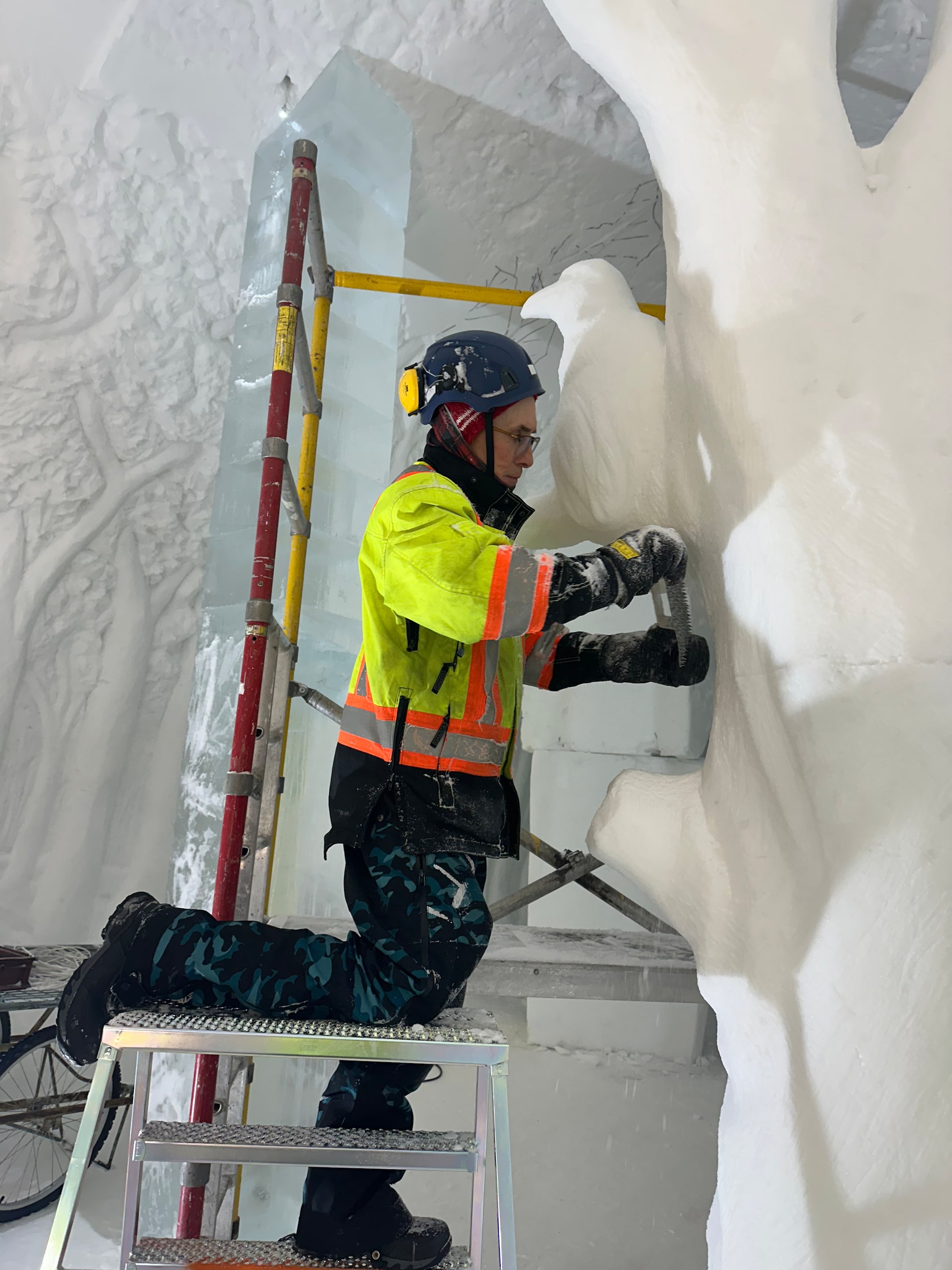 It’s our third time sculpting at this ephemeral hotel made of snow and ice. In 2019, we carved a hotel room to look like a jungle, with a larger-than-life cougar laying at the bottom of the bed. In 2023, we created another room to feel like the inside of a beaver lodge, with two enormous beavers on the walls and a soundtrack of gurgling streams and chewing noises. Each took us two weeks to carve but this time it would be over three weeks.