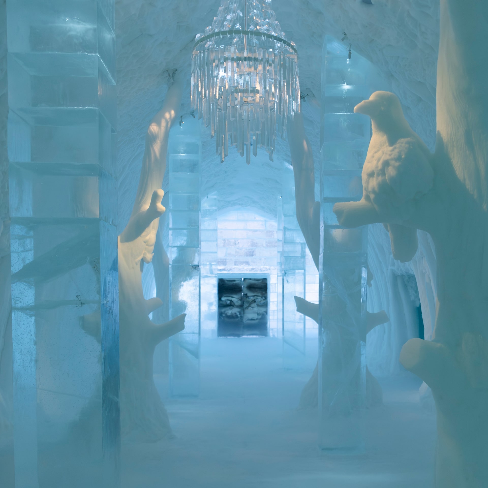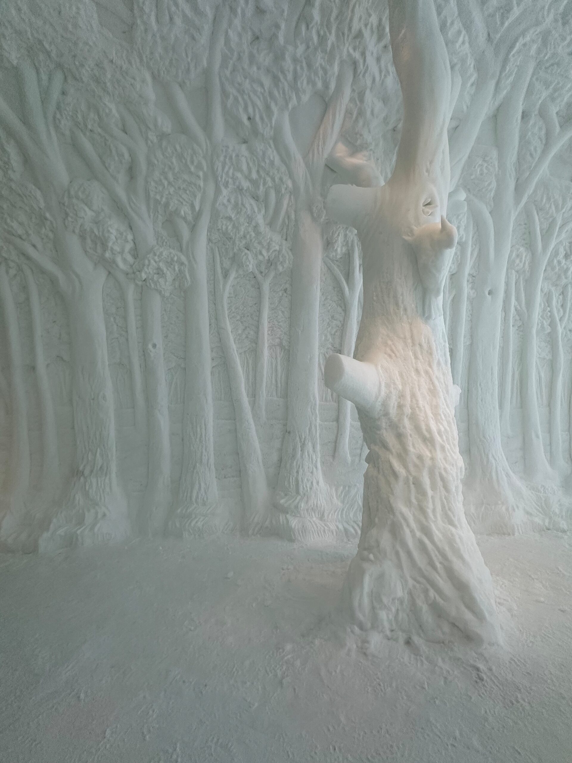 For the next few months, until the hotel melts in April, guests will enter the Icehotel to the sound of birds chirping while they weave through our carved trees under the dappled light filtered through the icy canopy.