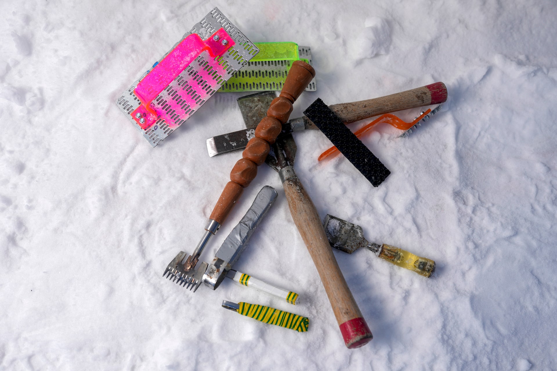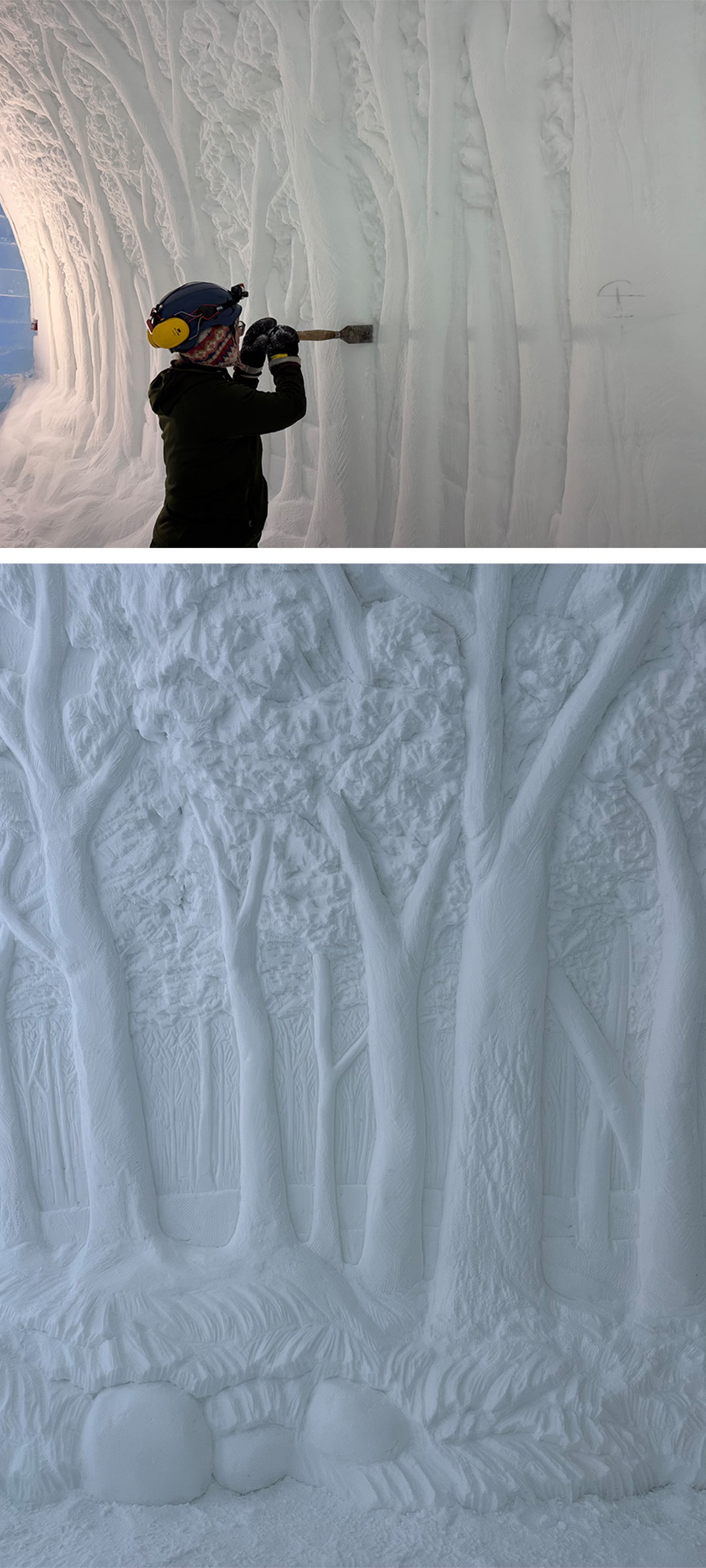 Within days, the wall design started taking shape. We used our favourite hand tool, a short squared-off garden shovel with sharp teeth, to isolate larger trees in the foreground from the ones in the middle and background. We shaped the trees with smaller chisels and sanders. If we made a mistake, we’d fix it quickly by creating “snice” (snow and ice): We’d put fresh snow in a bucket and hold a heat gun over it while vigorously mixing with our waterproof mitts. This creates a packing snow that can easily be reworked into the wall.