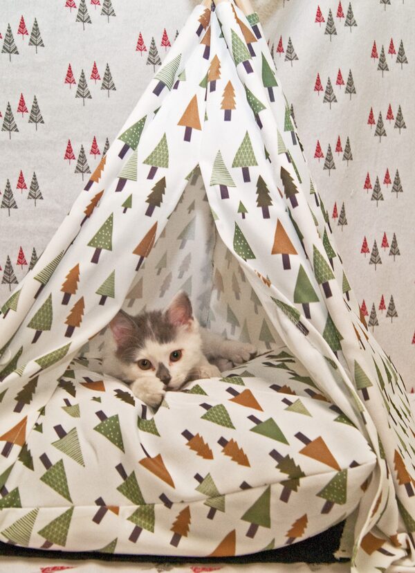 What’s cuter than a kitten in a pet tent? A wobbly kitten in a pet tent. At just two months old, Grover lives with a condition called cerebellar hypoplasia (which some kittens actually outgrow), meaning he’s a bit off balance and has a wobbly demeanor. The locally-made play tent (Woof Concept, $99.99) is the most fashionable pet bed I’ve seen in a while – with a plush, washable cushion, it’s great for cats and small dogs alike. And Vancouver-based Woof Concept gives a proceed of every tent sold to local and international rescue organizations. What’s better than that?