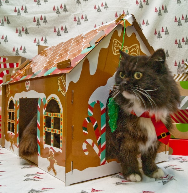 I wasn’t sure how a rescue cat would feel about exploring a cardboard gingerbread house (petsmart.ca, $24.99) while surrounded by strangers. Turns out, for Miss Kitty, the answer is very good. This 12-year-old gorgeous kitten at heart immediately started modelling, chin scratching at one door, while her tail effortlessly wagged out the other. She’s the model your home needs this holiday.