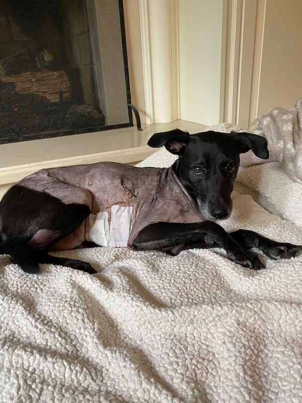 Kahlua the Mexican rescue dog, shaved and bandaged after a coyote attack last year.Courtesy of Mary Youngson
