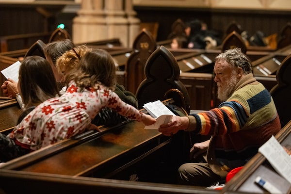 While the Merry Moment ran like a Swiss watch, the mood in the Anglican cathedral felt breezy. People were invited to sit, stand or kneel, whatever felt comfortable. A trio of parishioners wearing festive red sweaters and scarves sang along to familiar carols with a small troupe of robed chorists.